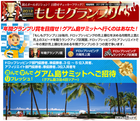 もしもが提供する「もしもドロップシッピング」および「もしもアフィリエイト」サービスを利用して売上を競う会員向けコンテストで、1年間を通して競う「年間グランプリ賞」と月間の売上げを競う「ドロップシッピング月間売上賞」、目標売上げ達成の速さを競う「ドロップシッピングランクアップ区間賞」の3部門からなり、ショップオーナーであれば誰でも無料で参加できます。