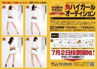 居酒屋はなこオリジナル「角ハイガールオーディション」は、「居酒屋はなこ」が完全プロデュースしてオリジナル角ハイボールモデルを選ぶオーディションです。フェイスブックの投票ページからの投票で7、8、9月の各月4名のエントリー者から1名のグランプリを決め、10月に各月のグランプリと敗者復活枠からファイナルグランプリを決定します。グランプリを勝ち取ったエントリー者は「2012年居酒屋はなこ角ハイボールキャンペーンガール」になることができます。各月のエントリー者は「居酒屋はなこ」のフェイスブックの投票ページで紹介されます。ぜひチェックして投票に参加してください。