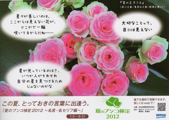 「夏のブンコ検定2012」は、夏の恒例企画となっている角川グループパブリッシング・集英社・新潮社各社の夏の文庫フェア展開作品の中から今回は「名言・名セリフ」をテーマに作品についての内容をクイズ形式で問うものです。対象作品を読めばわかる、クイズの答えを探すことによって、新たな本と出会ったり、以前読んだ本をもう一度手に取るきっかけを作り、書店店頭の活性化をめざします。