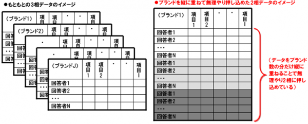 従来、『回答者』、『ブランド』、『評価』のような3相データについて、多変量解析を行おうとした場合、その多くは、3相データを『回答者』と『評価』の2相データに置き換えて分析するという、簡便的な方法が用いられてきました。