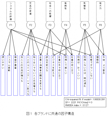 まず、SNSの4ブランドについて、17項目から、ブランド共通で6つの因子が抽出されました
