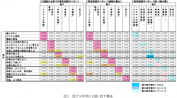 次に、項目別の因子パタンについて、3相因子分析と2相積み重ねデータを用いた因子分析を行い、結果を比較しました(図2)。