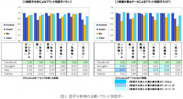 因子ごとに各ブランドではどのように評価が違うのか、「Fecebook」を1として、結果の違いを比較しました(図3)。