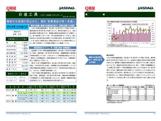 12年3月期の連結業績は、売上高5,781百万円(11/3期比16%増),営業利益962百万円(同21%増)となった。東日本大震災により,生産面は期初に影響を受けたが,販売面は顧客の在庫投資などで好調だった。第2四半期(11年7-9月),第3四半期(同年10-12月)は,売れ筋を中心に高水準の生産を続けたため採算も改善。第4四半期(12年1-3月)はあまり数量の出ない製品の生産も行ったため・・・