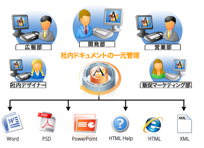 ・同一コンテンツをPDF、ヘルプファイル、WORD、PowerPoint、HTML、XMLなど多様な形式、レイアウトに出力。タブレット機器への出力も可能です。