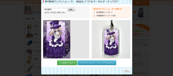 オリジナルグッズ製作サイト「MYDOO(まいどぅー)」 は、自分が制作したキャラクター画像や写真、文字などの画像データを元に、キーホルダー・ストラップ・木札・絵馬・缶バッチ・iPhoneステッカーなど様々なオリジナルグッズを安価かつ高品質に製作することができるサービスです。