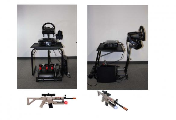 超短焦点の3Dプロジェクター(Optoma GT750)を使うことで、PS3のゲーム画面を約1.5mの焦点距離で100インチ大のスクリーン(白壁への投影も可能)を可能にします。 また、3Dメガネ(XpanD X102 DLP Linkメガネ)を使うことで、3D対応のPS3ソフトやブルーレイ映画を3Dで観賞できます。 レーシングホイール(ステアリングコントローラー)は、ドライビングゲームに対応しており、迫力ある運転やレースのシミュレーションが可能です。 アサルトライフル型コントローラは、シューティングゲームに対応しており、リアリティのある射撃ゲームが可能となります。