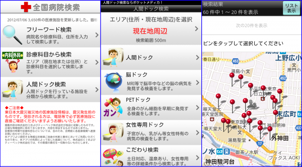 今回のアップデートでは、ユーザから要望の多かった「地図検索」と「人間ドック検索」の機能が追加されました。「地図検索」では地図上から視覚的に場所を確認して病院を検索することができます。また「人間ドック検索」では現住所や住所とともに「人間ドック」、「脳ドック」、「PETドック」、「女性専用ドック」などのカテゴリ検索や様々な条件を付加できるこだわり検索機能が提供されています。両機能とも無料で提供されています。