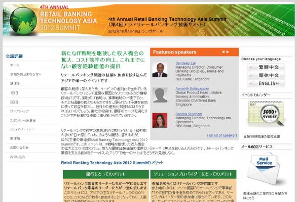 株式会社グローバル インフォメーションでは、皆様の利便性を図る為に、日本語、英語、韓国語、中国語で「4th Annual Retail Banking Technology Asia Summit (第4回アジアリテールバンキング技術サミット)」の情報を提供するとともに、会議の参加のお申し込みを承っております。