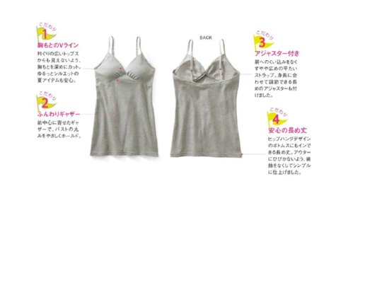 ヤマシタトモコさんの「楽チン」を重視しながら「インナーでありながらも外に着ていける」「ボディメイクするのではなく体のラインを自然に見せたい」という細やかな要望が形になった、徹底してディテールにこだわった商品です。すでに市場に出回っているブラキャミとはまた違う使用感の仕上がりとなっています。デザインや色はきわめてベーシックで、多くの女性が感じている細かなニーズにフィットする商品としてご好評をいただいています。