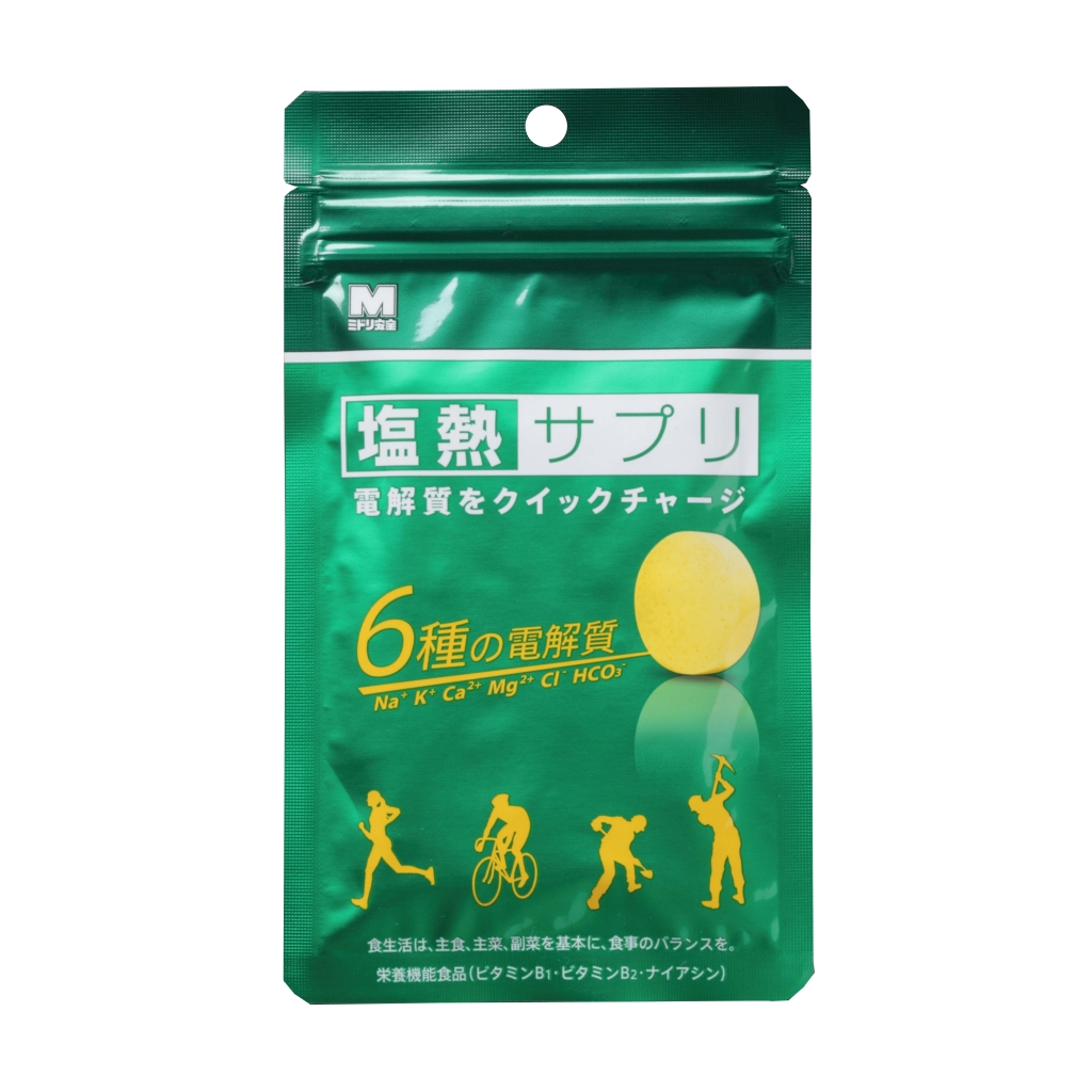 当社の「塩熱サプリ」は、ナトリウムを中心として、カリウム、マグネシウム、ナイアシン、塩化イオン、炭酸水素イオンの6つのイオン(電解質)を含んだ、熱中症対策サプリメントです。水分100mlを合わせて摂ると、厚生労働省が熱中症予防として推奨する食塩水(塩分濃度0.1~0.2%配合)と同じナトリウム濃度となります。スポーツに求められるビタミン類もバランス良く配合しており、アスリートの方にもオススメです。