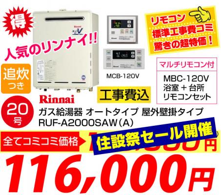 20号 追い炊き付給湯器が工事費コミで ¥116,000-