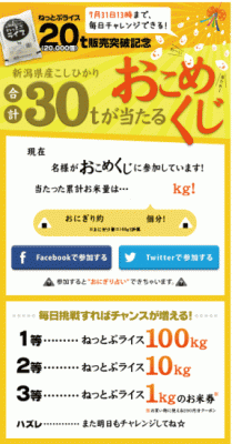 FacebookもしくはTwitterアカウントをお持ちの方ならどなたでも参加が可能です。ネットプライスWEB・モバイルサイトの「おこめくじ」特設ページから参加し、メールアドレスを登録すると「おこめくじ」を引くことができます。当選するとFacebook、Twitterのタイムライン上に「当選」メッセージが流れ、ご登録いただいたメールアドレスに、当選クーポン取得用のURL付きメールが届きます。期間中は毎日、1日1回「おこめくじ」を引くことができます。