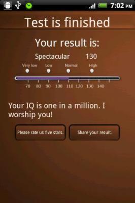 テスト結果は簡単なグラフと一言コメントで表示されます。一般的に、IQ80~120は普通、120以上は優秀と見なされます。さて、あなたのIQは?