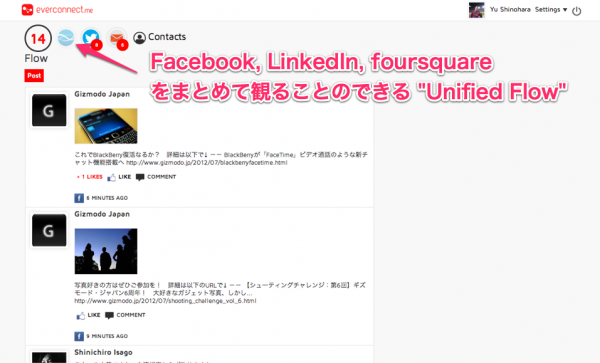 この度、エバーコネクト株式会社は、2012年2月より招待制で提供していたFacebookやtwitterなどのソーシャルネットワーキングサービスやGmailなど、複数のコミュニケーションサービスを管理しなければならないインターネットユーザの課題を解決するため、1ヶ所にまとめて利用することができるソーシャルコミュニケーションプラットフォーム「EverConnect.me Beta」を、ベータユーザからのフィードバックを基に改善を重ね、本日「everconnect.me」として、正式に提供を開始致しました。まず、英語版のみ提供を開始した後(※)、今後、世界中のインターネットユーザに向け、順次サービス提供言語を拡大していく予定です。