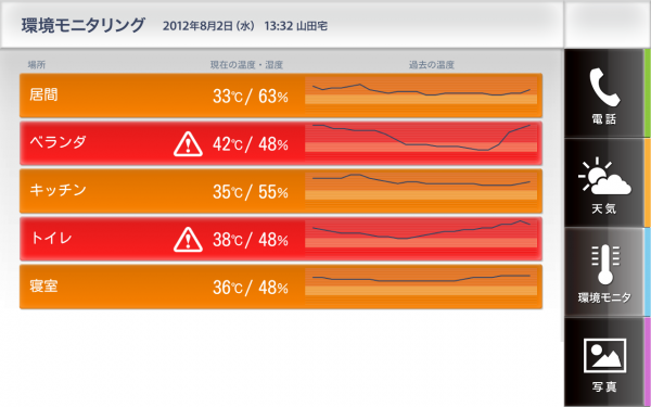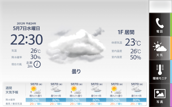 屋内に設置したタブレット端末を介して、「気象状況閲覧」「個別環境モニタリング」「ヒーリング」「信頼できる人との会話」といった情報提供ならびに相互情報発信のコミュニケーション支援機能を多彩かつシンプルに配し、ワンタッチでの操作を追及しました。