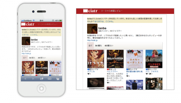 ciatr[シアター]は、友達や気になる人のレビューや評価で映画の評判を知ることができる今までにない映画レビューサービスです。見ず知らずの人の映画評価でなく、友達や好みが合う人など信頼できる人の評価だけで映画の点数を知ることができます。さらに、観た映画や観たい映画を簡単に綺麗に記録することもでき、自分だけの映画の記録をつけることができます。パソコンまたはスマートフォンの両方からサイトにアクセスして利用できます。また、ciatr[シアター]は2011年に大学生によって企画・開発され2012年3月に法人化した、学生発のベンチャー企業に運営されています。FacebookとTwitterのアカウント両方で利用できる映画レビューサービスとして2012年4月にリニューアルし、現在までに4万件の映画に関する投稿があります。