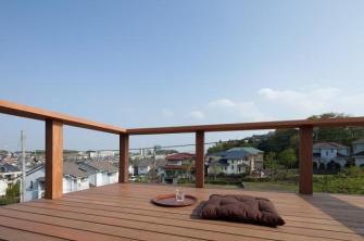 広いデッキテラス:雨に濡れない場所で雨を眺めるのも楽しいものです。また、ちょっとしたお客さんとはこのデッキテラスのベンチで世間話。雨で外遊びが出来ずぐずっている小さなお子さんも半戸外のこの場所があれば機嫌を直してくれるかも。豊かな自然の恵みを享受する家です。