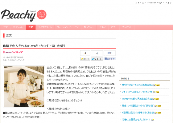 結婚式場選びNo.1口コミサイト「みんなのウェディング」※( http://www.mwed.jp/ )を運営する株式会社みんなのウェディング(本社:東京都中央区、代表取締役:飯尾慶介)は、毎日をハッピーに生きる女性のためのニュースサイト「Peachy」 ( http://girls.livedoor.com/ ) を運営するNHN Japan株式会社(本社:東京都品川区、代表取締役社長:森川 亮)と連携し、人気コラム「みんなのリアルウェディング」の配信を、2012年7月23日より開始いたしました。