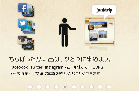 Fantarip.comでは、ソーシャルメディアに投稿した画像や、テキストを使い、人それぞれ、旅ごとの旅行記を簡単に個性的に作成することができるソーシャル旅行記作成サービスです。また、Facebookと連携したサービスであるためFacebook上でも旅行記を共有することや、コメントをFacebook上で共有することが可能なサービスです。
