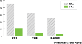 糖尿病はすい蔵のインスリンの分泌が少なくなることで引き起こされる病気です。日本人はこのインスリンの分泌能力が、欧米人の4分の1ほどしかありません(画像左)。欧米人の糖尿病患者と比べても、日本人健常者のインスリン分泌能力のほうがはるかに低く、半分以下です。