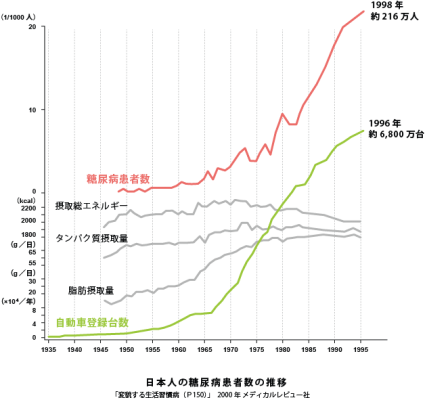 日本人の糖尿病患者は、自動車の普及とともに増えています(画像右)。これは、自動車を使う生活で運動量が減少したにも関わらず、それまでと同じ食生活を続けていたためにすい蔵に負担がかかり、糖尿病に繋がったと考えられます。
