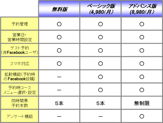 本システムは「無料」からご利用頂けます(無料版はお客様の予約時メニュー設定や同時予約受付本数が5本まで等の制限が御座います)。詳しいサービス体系は下記添付をご覧下さい。