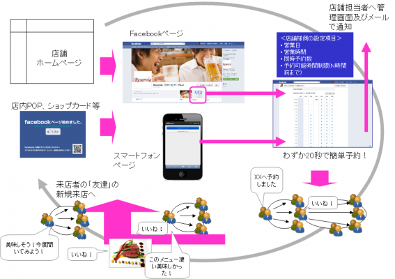 本システムは店舗担当者がWEB上の管理画面にて予約状況をリアルタイムで反映することで、来店するお客様がFacebookページや店舗ホームページより空き状況を確認の上、来店予約登録が出来る仕組みです。