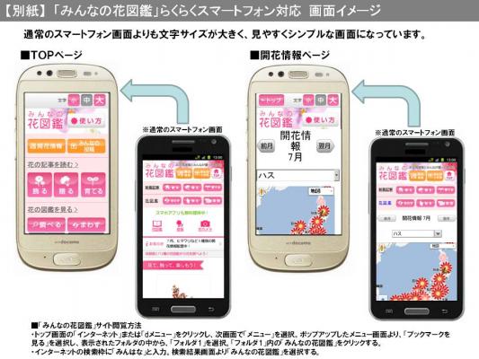 花の製作委員会(※1)が提供している「みんなの花図鑑」は、花がくるくると回る映像や開花動画が人気の日本最大級の花図鑑サイトです。これまでPC向けサイト、スマートフォン向けサイトを提供してきましたが、このたび、ドコモAndroidスマートフォン「らくらくスマートフォン F-12D」端末を対象に、らくらくスマートフォン最適化サイトの提供を開始しました。