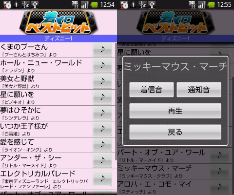 同シリーズは演歌やJ-popなど既に11アプリをリリースしております。今回はディズニー作品の曲を収録した「ディズニー 1」編と、氷川きよしの名曲・定番曲をテーマにした「氷川きよし 名曲集1」編の2アプリをリリース。各アプリに12曲ずつ収録しており、アプリから着信音や、通知音に設定することが可能です。
