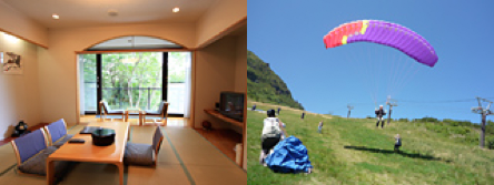 「R&Sホテル那須プラトー」(左)と “パラグライダー体験割引プラン” イメージ(写真下)