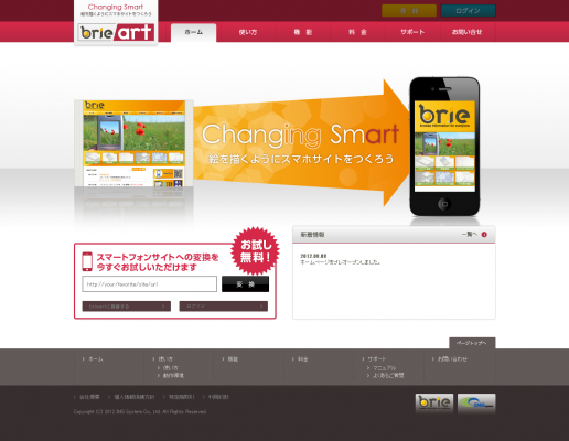 株式会社アイ・エヌ・ジーシステム(所在地:東京都台東区台東1-11-10 大木ビル3F 代表取締役 菱沼 博幸)は、2012年9月1日より、既存のPCサイトを、特別な知識や高額なツールなどがなくても誰でも手軽にスマートフォンサイトへ変換できるサービス「brieart (ブリエアート): http://brie-ing.com/」の提供を開始いたします。