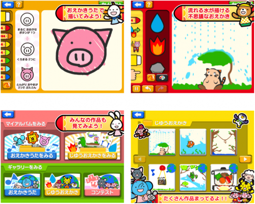 1.絵かき歌で遊ぶ: 絵かき歌を見て自由に歌いながら絵が描けます。完成すると絵が動き出します!