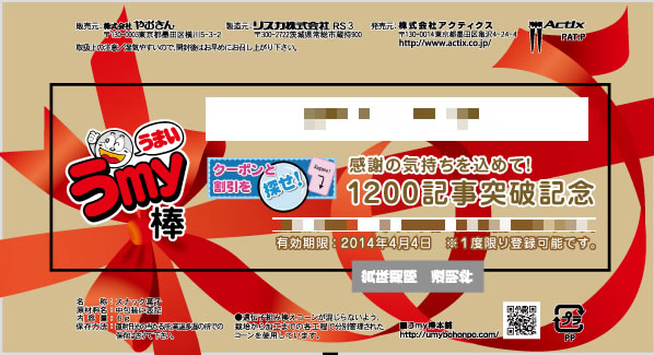 インターネットメディア事業を展開するFAZER株式会社(本社:東京都大田区)は、2012年8月9日より、クーポンと割引を探せ!の累計記事数が1200記事を突破したことを記念して、市販のうまい棒1100本にオリジナルデザインの1000円分のクーポン付きうまい棒100本を加えて合計1200本を抽選で1名様にプレゼントするキャンペーンを開催いたします。
