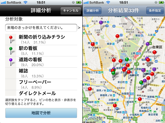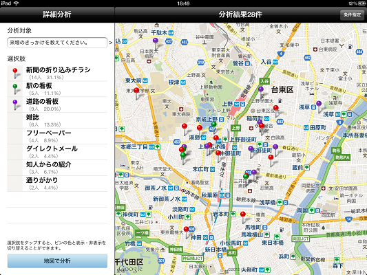 システム開発のコンポーネントデザイン株式会社(所在地:東京都千代田区 社長:山口達雄)は、2012年8月9日よりiPhoneおよびiPadで利用できるエリアマーケティングアプリ(名称:KURERU分析(クレル分析))の提供を開始致しました。このアプリでは、当社が提供する別のアプリ「iPadアンケートアプリKURERU(クレル)Ver 2.1」で実施したアンケートの結果を地図上で分析することができます。