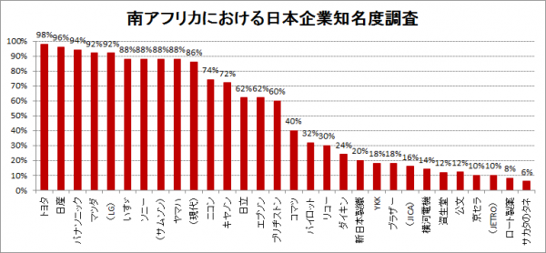 1人あたりGDPが8,070USD(2011年;世銀)に達し、中国、ブラジルと同じ「高・中所得国」に分類される南アフリカ。整備された道路には中古車を含む日本車が多く走り、日系自動車メーカーにとっては生産拠点としてだけでなく販売拠点としても重要なこの国で、トヨタ、日産、マツダの知名度は9割を超え、南アの一般市民から日本と変わらぬ知名を得ていることが分かった。