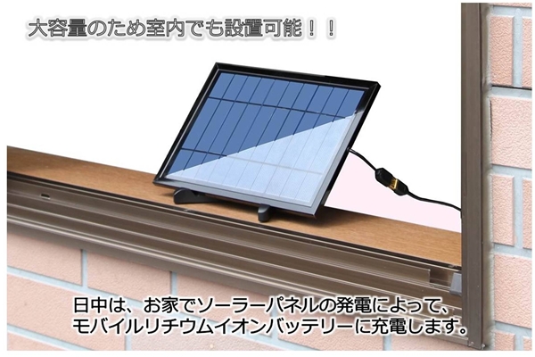 大容量の太陽電池モジュールを使用しているため、非常用としても充分活用出来ます。付属のリチウムイオンバッテリーにはLEDランプを搭載。停電時にも活躍します。