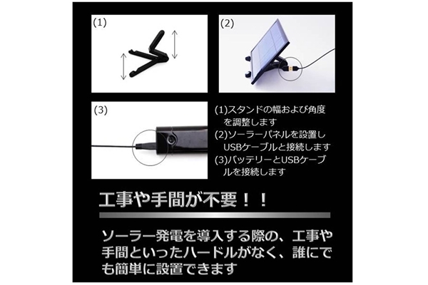 誰でも分かりやすく、簡単にソーラー発電が導入出来ることをもう一つのコンセプトに掲げており、モジュールだけでなく、バッテリー、スタンド、USBケーブル、ACアダプタ、各種コネクタなども付属しております。全てを付属することにより、この商品をご購入されること以外の一切の手間を省きました。付属の角度を調節することが可能なスタンドを自宅の窓際に置き、パネルを立て掛けるだけで使用出来るので、団地、マンションにお住まいでソーラーシステムの導入が難しいと思っている方でもお手軽に、おしゃれにソーラー発電を導入することが可能です。さらに持ち運びも簡単で設置の手間もいらないため、アウトドア商品にも最適です。