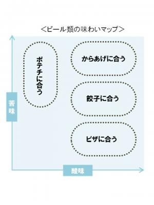 下図は、ビールの味わいについて、苦味を縦軸・酸味を横軸にとったマップ上に、その味わいごとに合うおつまみを記したものです。この図からもビールの味わいごとに、それと相性の良いおつまみがきれいに棲み分けた分布を取ることが分かります。