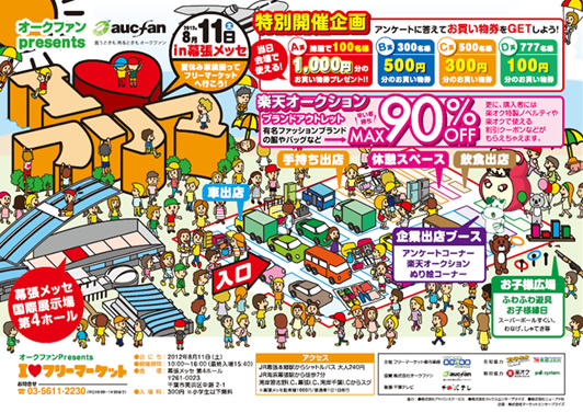 今回のフリーマーケットは千葉県を中心に関東各所から約300店が出店、企業ブースも多数出店された。オークファンによるショッピング・オークション一括検索・比較サイトの解説ブースをはじめ、有名ファッションブランドが最大90%OFFにて販売される特別ブースを楽天オークションが出店、多くの女性客で会場を賑わせた。こども広場では縁日コーナーやふわふわ遊具などもあり、沢山のファミリー客が集まった。