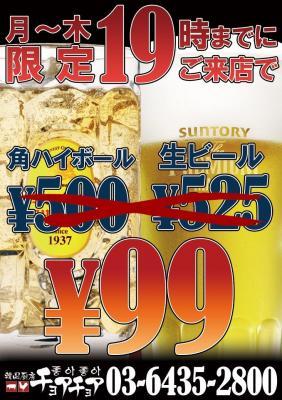 2012年8月16日(木)より9月27日(木)までの期間中、プレミアムモルツ(生)(通常価格:525円税込)と角ハイボール(通常価格:500円税込)を、月曜日から木曜日の17時から19時にご注文された方限定で、特別還元価格の99円(税込)でご提供いたします。時間内なら何杯ご注文されても特別価格を適用いたします。