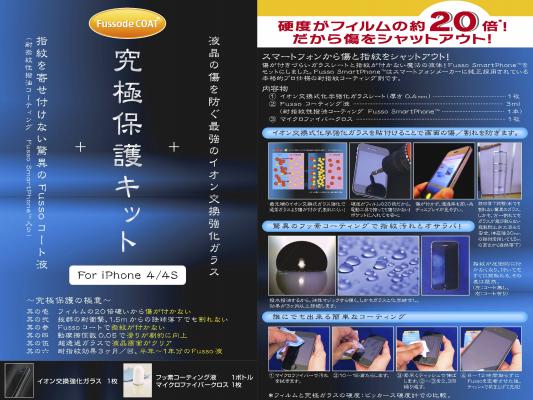 「究極保護キット For iPhone4/4S」は、通常の液晶保護フィルムの約20倍の硬度をもつイオン交換式化学強化ガラスフィルムとグローバルスマートフォンメーカーにも純正採用され、指紋防止コーティングキットとして発売されている当社のスマートフォン用耐指紋性撥油コーティング「Fusso SmartPhone」をセットにした商品です。