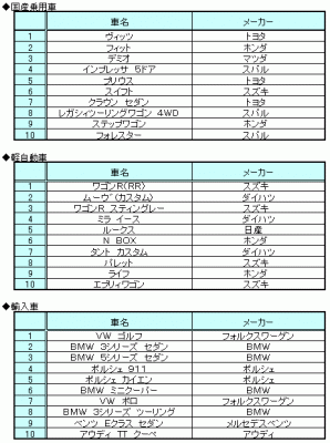 国産車部門では、ヴィッツ(トヨタ)が3ヶ月ぶりに首位に立ちました。