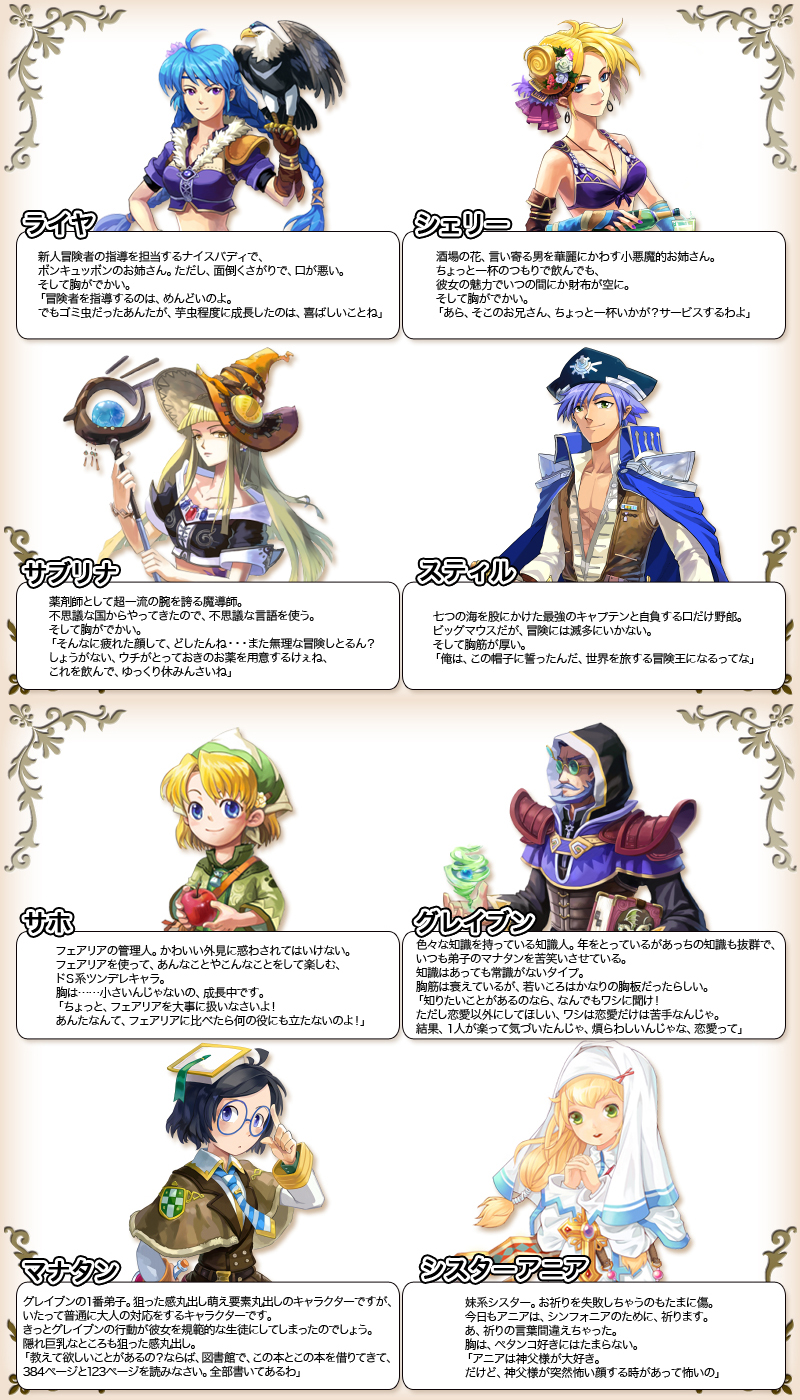面倒くさがりの新人指導官や、神父様にあこがれるロリッ娘シスター、威張り散らすくせに何もしない衛兵など、個性がキツ目のキャラクター達が、ゲームの世界に花を添えてくれます。