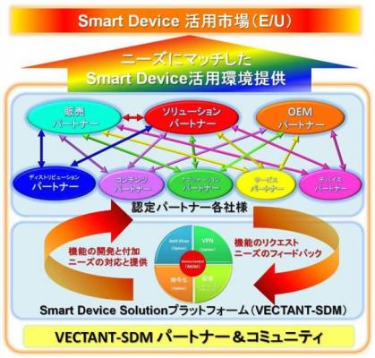 「VECTANT SDMパートナープログラム」は、企業がスマートデバイスを導入・活用する際に必要となる様々な技術やサービスを有したパートナー企業が集まり、VECTANT SDMをスマートデバイス導入・活用のプラットフォームとしたコンソーシアムを形成いたします。それにより、スマートデバイスの導入から活用までの幅広い過程においてユーザ企業を支援し、更にはスマートデバイス活用市場を活性化することを目的としております。