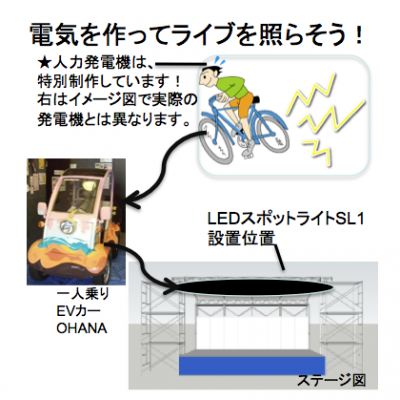 また今回のイベントでは、人力発電で夕方のライブステージの照明をつける電力を作ります。