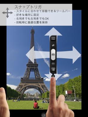 特に、スナップトリガ(特許出願中)は、iPadに完全に適合しています。コントロールバーを画面のどこにでも自由に配置できるので、自分なりのやり方で写真やビデオを撮影できます。新しい内部ライブラリーであるライトボックスは、より速く、写真やビデオを保存することができるとともに、複数の写真やビデオを簡単に削除、共有、エキスポートできます。