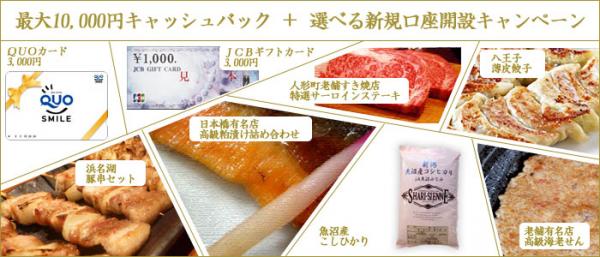 キャンペーン終了後、お客様のご登録金融機関の口座にキャッシュバックいたします。選べる景品は2012年11月中旬ごろ、郵送にて進呈いたします。