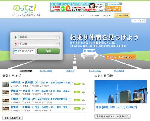 クルマの相乗り仲間を見つけるためのサイトです。同じ日に同じ方向に向かうユーザー同士で相乗りし、交通費(高速代、ガソリン代)を割り勘することによって、新幹線や高速バスより安く楽しく移動することができます。