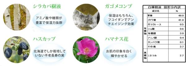 北海道産にこだわり、17種類のアミノ酸やミネラルが豊富なシラカバ樹液(芦別市産)、高い保水性を持つフコイダンを多く含むガゴメコンブ(江差町近海産)、北海道でしか採れないビタミン豊富なハスカップ(苫小牧市産)、江戸時代には水腫病の治療にも使われていたハマナス花(北見市産)、の4種の植物エキスを濃縮して配合しています。